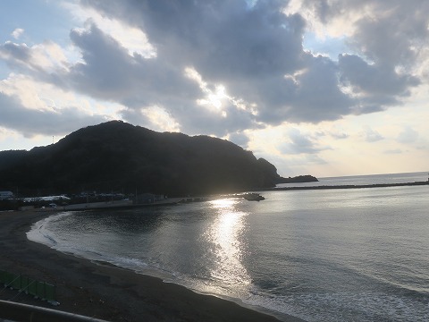 17:09 日の入り 一息ついて、温泉に行ってきました。 温泉は地下1階にあって、宿の規模からすると小さめでした。 場所柄、温泉宿と言うよりも夏休みに松崎に海水浴に来たお客さんをメインのターゲットとした感じのホテルかな。 部屋に戻ると、ちょうど日の入りの時刻でした。 けど、雲が多くてきれいな夕焼けにはなりませんでしたねぇ。 右手の方なんて、雨降ってそうだし。 晴れていたら、きれいでしょうね。 |