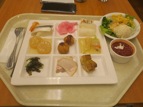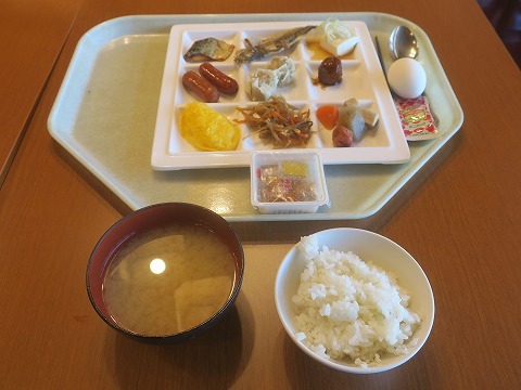 7:20 朝食です 朝食の時間は7時~9時までだったかな。 その時間内で好きな時間に。 起きてしばらくして2回のレストランに下りてきました。 朝食もブッフェ形式。 人員の削減、コストダウンが徹底されていますね。 それでは、「いただきます」 |