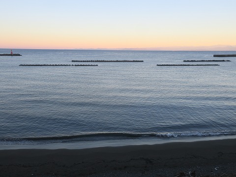 7:05 翌朝 朝目が覚めてベットから出て一番にやることは、窓の外を見る。 今日は雲ももなくきれいに晴れ上がっています。 目の前は西側の空になりますが、グラデーションがきれいです。 水平線近くには対岸の御前崎~焼津~静岡市が薄っすらと見えます。 |