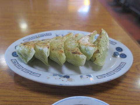 餃子は野菜多めで、野菜の食感が残っており、ショウガとニンニクが効いて、旨し。