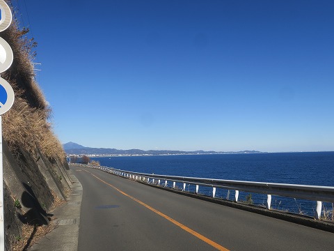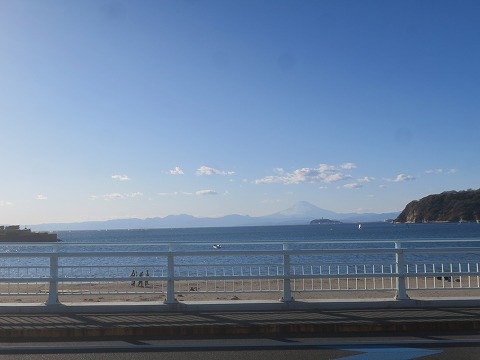 14:54 逗子海岸まで 小田原で干物をゲットしたら、国道1号線から国道134号線を東進して、逗子海岸まで戻ってきました。 逗子海岸の信号待ちの間に写真をば。 江の島の向こうに薄っすらと富士山のシルエットが見えています。 こうしてはっきり見えるのも、空気が澄んでいる冬の間だけですね。 |