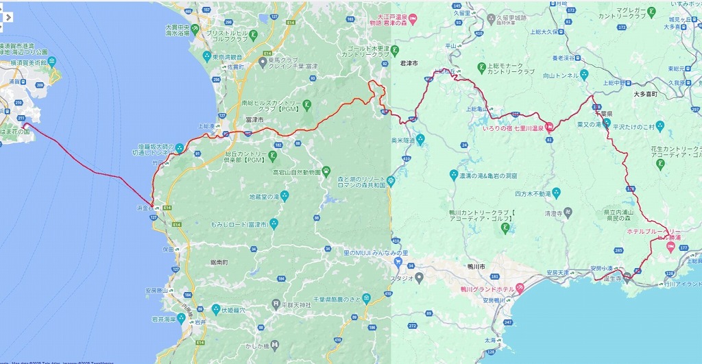 | 午前中の道程:自宅〜久里浜〜(東京湾フェリー)〜浜金谷〜湊〜(国道465号)〜養老渓谷〜安房小湊: | |