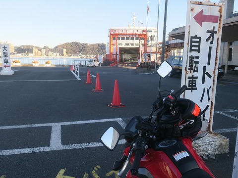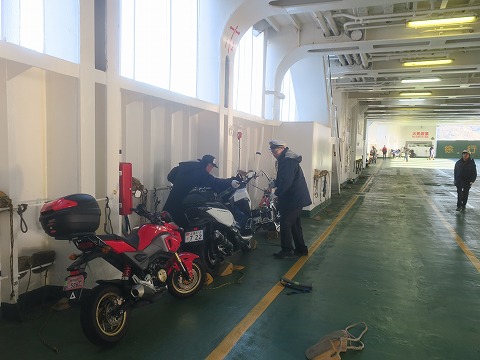 7:59 乗船 フェリーに乗り込みました。 前方にも既に乗船済みのバイクが4〜5台、自分の直前に2台居るので、自分は7番目くらいでした。 前回より増えてます。 これから季節が春へと向かうにしたがって、バイクの台数も増えるんでしょうね。 |