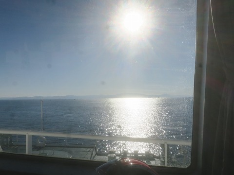 8:27 眩しい 前回は曇っていて、雲の合間から天使の階段(はしご)が見えましたが、今日は関東平野部の冬の天候らしく雲もなく快晴です。 おかげで先頭の席は、眩しすぎますぜ。(笑) お日様を避けるため3つほど席を下がって、ちょっと惰眠。 東京湾の波の少ないゆりかごの様な揺れと、ディーゼルエンジンの振動が居眠りにはちょうど良いんです。 |
