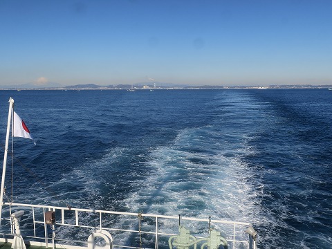 8:53 振り返れば 久里浜港〜金谷港までの間11.5kmを所用時間は40分。 あと5分ほどで金谷港に到着します。 フェリーの後方を眺めると、出発してきた三浦半島。 分かり難いですが、今日は左端に薄ぼんやりと富士山が見えています。 |