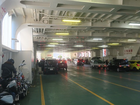 9:04 下船 フェリーが接岸すると、船内に下船の案内がアナウンスされて、車両デッキに下りてきました。 クルマの下船が始まっています。 オートバイはクルマが下りてからね。 |