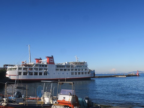 9:08 フェリーの写真を 下船したら、まずは目の前を走る国道127号線で北上。 その前にフェリーの写真を撮るのを忘れてました。 乗船するときも、バタバタして撮れませんでしたからね。 ので、信号待ちをしている間に写真を撮る。 今、載ってきたフェリーは、船体が白色なので”かなや丸”だね。 |