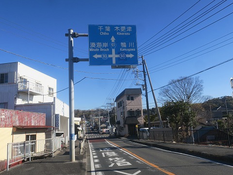 9:19 県道93号久留里鹿野山湊線(くるり かのうざん みなと せん)に フェリーふ頭から国道127号線を北上すること8km強、鴨川に向かう県道93号線との交差点までやってきました。 この交差点を右折して、県道93号線に入り、一旦鴨川方面に向かいます。 この後で、国道465号線に接続します。 |