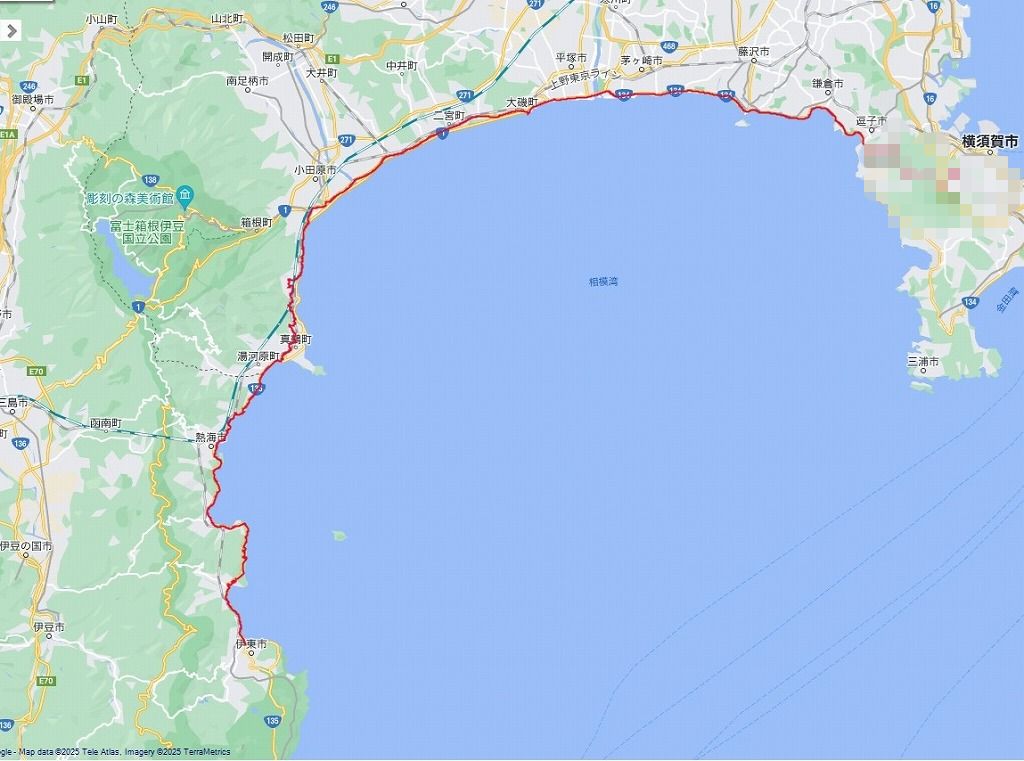 自宅のある横須賀を出発して、相模湾沿いに出て国道134号線を西走します。