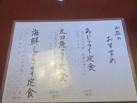11:31 注文は さて、何を食べましょうかね。 お品書きは別にありたくさんのメニューがありましたが、”おすすめ”から。 アジフライ定食と太刀魚フライ定食には、”杜仲うどん”が付きます。 杜仲うどんには、漢方の杜仲の葉の粉末が練り込まれているそうで。 これが蕎麦だったら、どっちか選んだんですが・・・。 で、注文は残りの”海鮮ミックスフライ”を注文しました。 なんか三日前に訪れた”かしわくら”と注文がダブってますね。(笑) |
