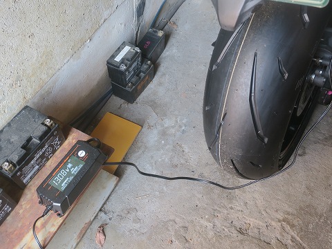 7:52 ツーリングの朝は バッテリーの充電状態を確認してから。 先週末、GSX-Rのタイヤ交換作業をしましたが、そのときメインスイッチをONにしたままにしてしまって・・・・。 タイヤ交換の作業が終わって、ガレージに入れようとエンジンをかけようとしたらセルが”うんともすんとも”言いません。 バッテリー上げちゃいましたぁぁぁ。 で、直後からバッテリを充電。 電圧は13.08Vで”完了”の表示が出たので大丈夫そうです。 流石に放電させちゃったので、逝っちゃったかと思いましたよ。 (^_^;) |