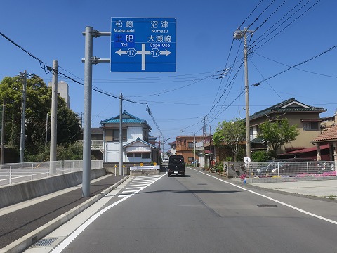 10:18 静岡県道17号沼津土肥線(ぬまづ とい せん)に 道の駅 函南で休憩した後は、裏道を走り、江間のイチゴ狩り畑の中を突っ切って、県道17号沼津土肥線に入りました。 手前の伊豆縦貫道が混んでフン詰まっている分、交通量は少な目。 駿河湾の海岸線を快適にバイクを走らせることができます。 |