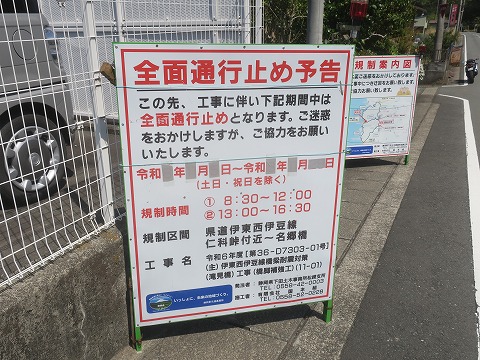 12:39 通行止め看板に 県道410号線に入ると、すぐに通行止め看板が・・・・。 (^_^;) 「慣れてますよ」(笑) この県道410号線の通行止めかと思いましたが、この先仁科峠手前からの県道59号伊東西伊豆線でした。 前回3月2日のツーリングの時にGROMで走ったルートですね。 工事期間が書いてないので、今は工事していないみたいですが、県道59号線を走るときは注意ですね。 |