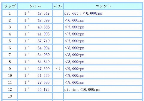 筑波サーキットの場合、1周の距離が短く鈴鹿の3分の1なので、各回転数で3周ぐらい走ればいいかなぁ。」って事でした。