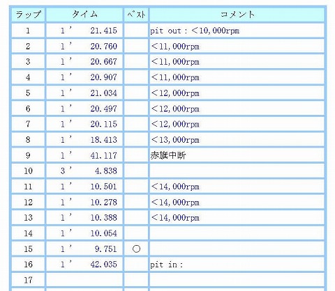 よく見れませんでしたが、15,000rpmくらいまで回しても、点灯しなかった様なので、メータ見て14,500rpmでシフトアップするように走って、最後15周目に本日のベスト1分9秒7でチェッカーが振られました。