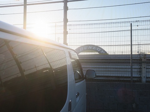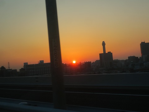 横浜ベイブリッジに到達するころには朝焼けの空に変わっていきます。