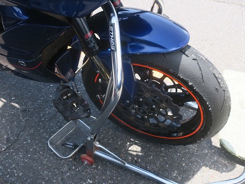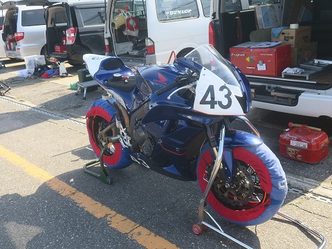 タイヤはほぼ終わってますが、必要かどうかわかりませんが、いつも通りタイヤウォーマーをかけてタイヤを暖めます。