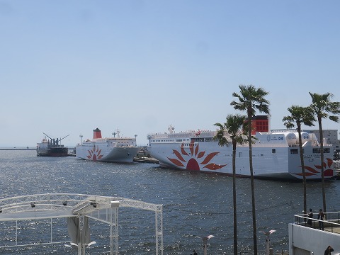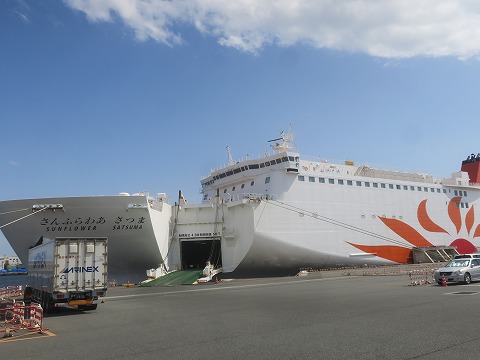 13:07 2隻のサンフラワー ATCの建物までやってきました。 志布志行きのフェリーふ頭から1kmくらいの距離がありました。 振り返ると、フェリーふ頭には2隻のサンフラワー。 手前側は別府行き、向こう側が自分が乗る予定の志布志行きですね。 |