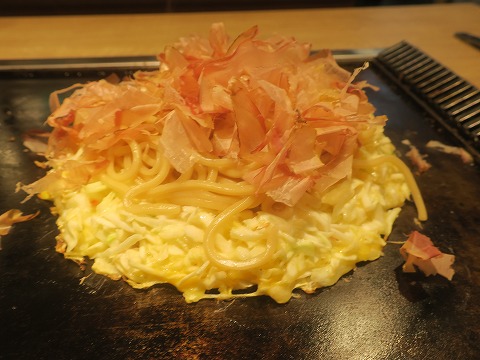 13:46 モダン焼きの麺が しばらくしたらお店のスタッフがきて、モダン焼きの麺とかつお節が載せられました。 お好み焼って時間かかるんですね。 |