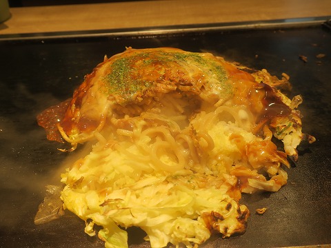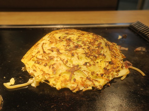 13:47 ひっくり返す しばらくして、上に載せられた具材が落ち着いたところで、ひっくり返されました。 ひっくり返す時に具材が飛んでくるんじゃないかと、怖いぞ。(笑) 裏面を焼くので、またしばらく待ちます。 |
