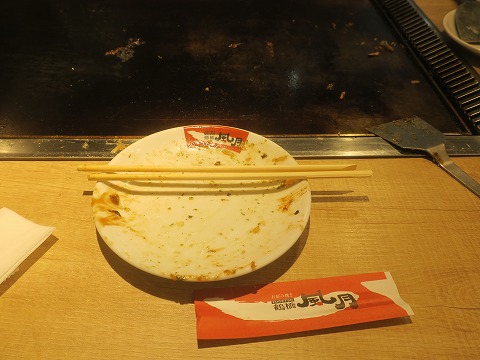 14:12 完食 かんしょく〜。 お好み焼きは、どうも食べた後がきれいじゃなくて、写真写りがよろしくないな。(笑) でも、「美味しかったです。」 |