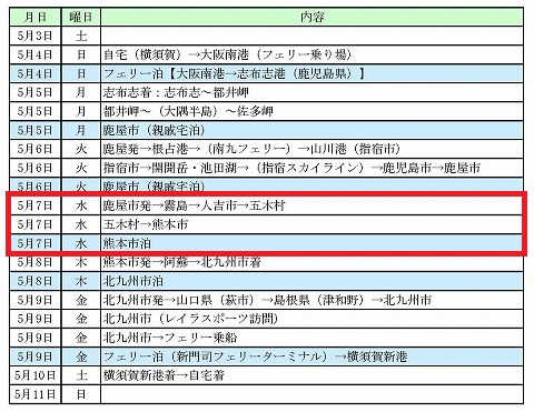今日の予定は 今日、4日目5月7日の予定は鹿屋市の親戚の家を出発して、霧島を通り、人吉市を経由して五木村に向かいます。 五木村で昼食を食べたら、熊本市に向かう計画です。 |