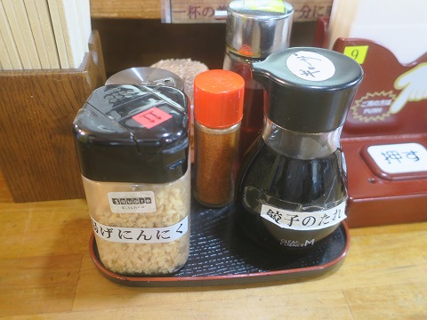 12:08 揚げにんにく 食券を買ったら空いているカウンターの席に。 テーブルセットは、(関東の)普通のラーメン屋にはあまり置いていない揚げにんにく。 後、七味は置いてあるところには、置いてある。かな。 |
