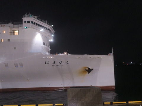 21:00 入港 21時になってフェリーが入港してきました。 時刻表だと、21時着になっていますので、少し遅れていますね。 このフェリーに乗って横須賀に戻る訳ですが、時刻表を見ると新門司21時着の出発が23時55分になっています。 停泊している2時間55分の間に、載ってきた車両をすべて下ろして、船内を清掃、そして車両の積込みを行います。 かなり時間的にタイトだと思いますね。 停泊中には、燃料や水の補給、下水の排出なんかもする必要がありますからね。 |