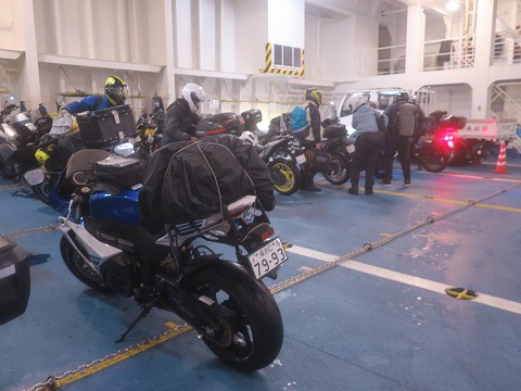 23:53 乗船が始まる 日付けが変わる直前になって、バイクの乗船が始まりました。 1時間近く遅れているようです。 雨はほぼ止みましたが、今さらカッパを脱いでもね。 |