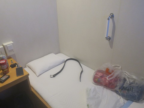 0:33 個室に変更 荷物を持って船室に入りました。 事前の予約では、カプセルホテルタイプの”ツーリストA”を予約してありました。 ただツーリストAだとベットスペースしか無いので濡れた服を乾かすスペースもありません。 チェックインの時に、個室タイプのツーリストSの部屋が空いていたので、アップグレードしました。 差額6,000円也。 思ったより高かった。(-_-;) 行きの大阪発志布志着のフェリーのアップグレードの差額が2,000円だったのにね。 夜も遅いので、今晩はさっさと風呂に入って、缶ビール飲んで寝ます。 |