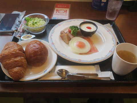 8:39 朝食は 東京九州フェリーはサンフラワーの様にブッフェではなく、料理を注文するスタイルです。 注文したのは、”洋食プレートセット”。 1,200円とちと高い。 メニュはこれ以外に和風プレートセットとか、朝カレーセット、モーニングセットとかありましたね。 |