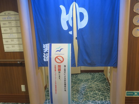 16:30 風呂は 時間を持余しているので、フェリーが着く前にゆっくりと風呂でも入ろうと、大風呂にやってきたら・・・・・。 ”荒天のため閉鎖中”でした。」 以前だったら、これくらいの揺れでも風呂に入れたのにね。 残念。 |