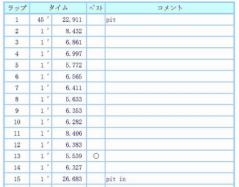 10:10〜10:30 走行1本目 1本目のラップタイム。 いつもの様に徐々にタイムを上げていきます。 3周目にピットに入ってるんだね。 何のためにピットに入ったか忘れました。 (-_-;) その後、再度コースイン。 6周目、7周目後続を待ってペースダウン。 去年の走行会の時にGPSラップタイマーを落としてしまったので、走行中にタイムは分かりません。 次回までにGPSのラップタイマーを入手したいところです。 8周目から淡々と走って、最後の17周目にポンと6秒台で、6秒4。 ピットインします。 |