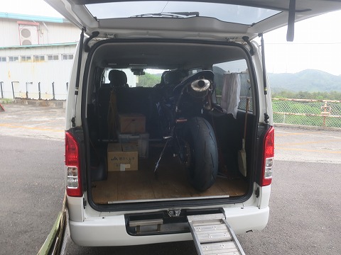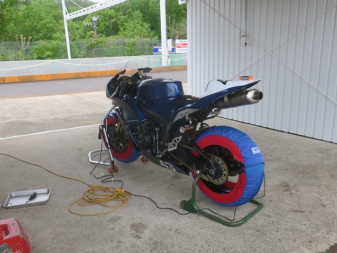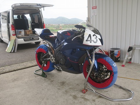 8:43 タイヤを暖める ハイエースからCBRを下ろしたら、エアー圧を確認して、タイヤウォーマーを巻いて暖め開始です。 寒くない時期ですが、1時間くらいは暖めたいですね。 |