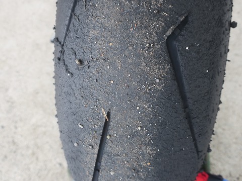 10:35 タイヤのコンディションは 1本目の走行を終えてピットに戻ってきました。 リヤのタイヤを確認すると、筑波サーキットで走行したときに比べて、荒れてますね。 筑波と違って、エビスサーキットは路面のうねりとかギャップが多いので、タイヤのトレッドも荒れがちになるのかな。(自分の場合) |
