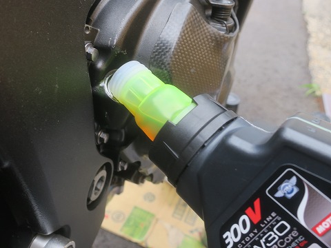15:54 オイル注入 オイルを入れていきます。 ところで、なんでMOTUL の300Vって緑色なんですかね? 原料の色が緑じゃなくて、色を着けていると思うんですが。 普通、オイルって言うと茶褐色ですね。 |