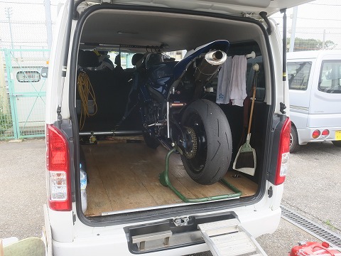 10:49 積込み中 タイヤのチェックも終わって、タイムも記録したら、片付けます。 まずはCBRをハイエースの荷室に積込み。 この時期だと、まだエンジンが熱々なので、室内の温度が激上がりします。(笑) |