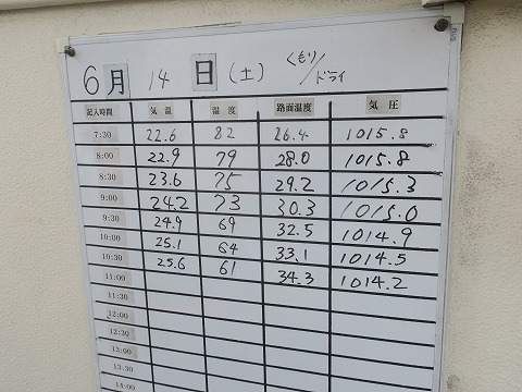10:56 コンディションは 腕章を返却したら、コントロールタワー脇のコースインゲート脇に掲示してあるコンディションボードを確認。 1本目の8時からの走行の時は 8:00 気温 22.9℃ 路面温度 28.0℃ 8:30 気温 23.6℃ 路面温度 29.2℃ 2本目の9時40分からの走行の時は 9:30 気温 24.9℃ 路面温度 32.5℃ 10:00 気温 25.1℃ 路面温度 33.1℃ 湿度は高めでしたが、この時期として気温も高くなく、路面温度も30℃くらいで良いコンディションでしたね。 |