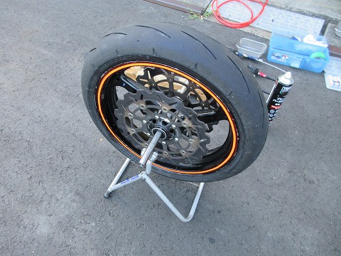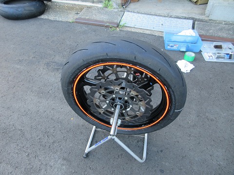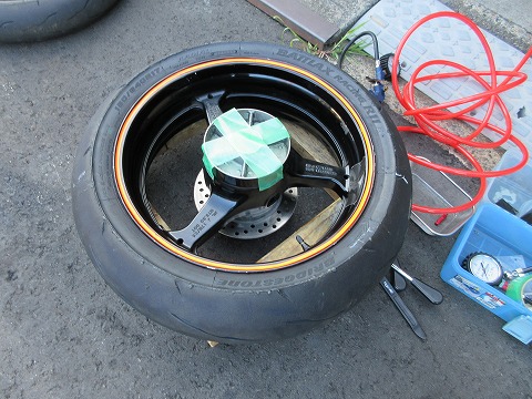 17:21 取り付けた ホイールにタイヤを取り付けました。 後は、エアーを入れてビートを上げます。 |