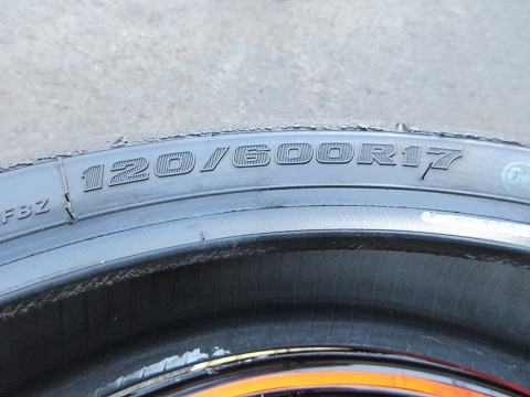 16:30 タイヤのサイズを確認 タイヤサイズは”180/640R17”。 180/640R17の640?って。 公道用のタイヤのサイズだと 180/60R17とかが標準で、二つ目の数字の”60”は偏平率。 タイヤ幅180mmの60% → 108mm(くらい)っていうことで表記していますが。 で、この表記の 640はタイヤの外形で640mmだそうです。 (BSのホームページより) |