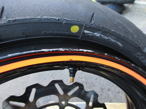 17:19 軽点マークを 黄色い丸は”軽点マーク”。 タイヤの一番軽いところに付いてます。 自分が使ってきた PIRELLI とか MICHELINとか外国製のタイヤだと付いてない場合が多いですね。 軽点マーク、久しぶりに見た感じ。(笑) この軽点マークは、アンバランスを出来るだけ相殺する様にホイールで一番重いと思われるエアーバルブの位置に合わせて組むのが一般的です。 でも、マニアックなところだと、ホイル単体でバランスを計測して、ホイールの一番重いところに軽点マークを持ってくる人もいるみたいです。 |