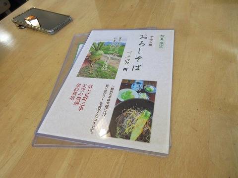 11:42 注文は 店内に入りテーブル席へ。 テーブル席は4卓くらい(?)、奥が小上がりになっていて3卓くらいあったかな。 テーブル席に座ったら、さっそくお品書きを。 目に飛び込んできたのは”辛味大根のおろしそば”。 初夏のこの季節限定のそばですね。 他のメニューは置いておいて、おろしそば! もちろん大盛りでございます。(笑) |