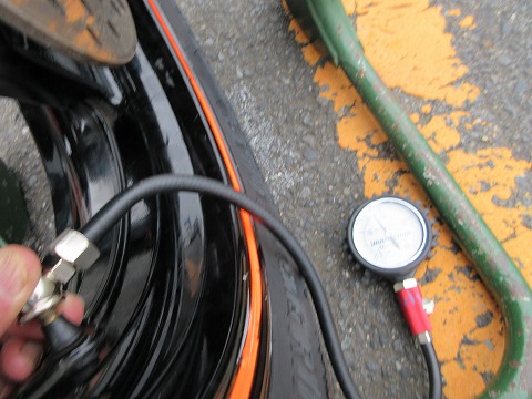 7:53 走る準備 7時10分からのライダースブリーフィングに参加した後、CBRの暖気。 そのあとに、さっき買ってきた新しいガソリンに入れ替え。 革つなぎに着替えたら、走行前にタイヤの空気圧をチェック。 タイヤを暖めた状態(温間)での空気圧はフロントが230kPa、リヤが210kPa。 これまで使っていたPIRELLIより全然高いけど大丈夫かな。 まあ、メーカが冷間でって言うんだから、とりあえずこれで走ってみましょう。 |