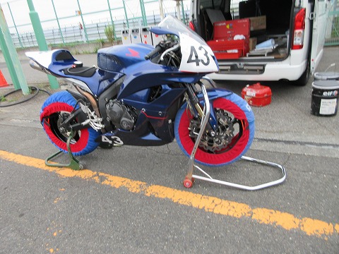 6:34 タイヤを暖める 冷間での空気圧の調整が終わったら、タイヤウォーマを巻いてタイヤを暖めます。 今日1本目の走行は朝一番の8時からです。 |