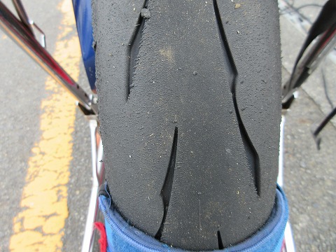 8:41 空気圧は こっちはリヤタイヤ。 こっちも表面はサラッと。 リヤのエアー圧は 215kPa で走行前が210kPaだったので、若干上がりました。 フロントは下がって、リヤが上がるのは、PIRELLIを履いているときもその傾向だったので、特に問題ないでしょう。 フロントに関して言えば、チェッカーを受けた後、ペースダウンして1周コースを回ってからパドックに帰ってくるので、走行風を直接受けることもあって若干下がるのも予想出来ます。 それでは、タイムを記録したら、ガソリンを補充して2本目の走行の準備をします。 (つづく) |