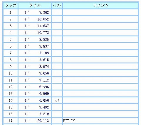 8:00〜8:20 B1クラス 8時になって今日1本目の走行のコースイン。 結局、天気は曇ったままで、暑くならなくて良いコンディションです。 まずは、お初のR11の感触から。 PIRELLIと比較すると、ケースが固いですね。 しっかり感があります。 どちらかと言うと、自分はしっかり感がある方が好みです。 ケースが固い分、路面からの情報が多い様に感じます。 後はPIRELLIのDIABLO SUPERCORSAと比較して、どの程度グリップするか。 元々、ST600のタイヤをワンメイクにしたのは、タイヤのライフをある程度確保して、保ちを良くしてランニングコストを下げることが目的の一つにありました。 そのため、R11はPIRELLIに比べるとグリップレベルは低い様です。 でも、自分レベルのライダーだと、それほど影響しないんじゃないかと、考えたんですけどね。 実際、練習走行でも全日本ライダーの様にタイヤを滑らせるまで走り込むなんてことは 3〜4周ほど、感覚を確認したら、5周目から徐々にペースを上げていきます。 タイヤのグリップ感はあるので、不安感はありません。 後はどの程度ペースを上げていったら、タイヤが滑るのか? その手前が、自分としてのペースです。 (いつもの事ですが)地味にペースアップをして、14周目にこの走行のベスト6秒6。 16周目にチェッカーが振られて、この回の走行終了です。 |