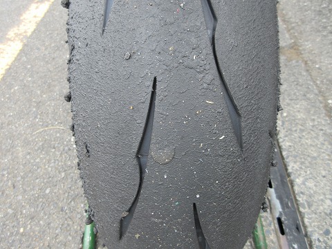 10:36 走行後のリヤタイヤは 走行後のタイヤの確認。 まずリヤタイヤ側。 タイムもタイムですから、比較的きれいに減ってます。 今回は、ブリヂストンのHPに記載してある冷間の推奨空気圧からタイヤウォーマーをかけて、走行前に210kPaまで空気圧が上がった状態で走行をしました。 走った感じとしては、ちょっとエアー圧が高すぎる様に感じました。 自分の感覚としては、もう少し下げたいところです。 ただ、下げ過ぎてしまうとトラブルが出たりする可能性もあり怖いです。 実際に走るときは、皆さんどの程度の空気圧で走行しているのか、情報を集めないとですね。 |
