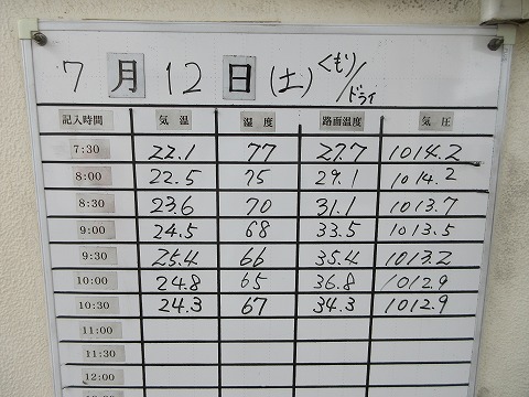 10:56 コンディションは 腕章を返却したら、次はコントロールタワー下のコースインゲート脇に掲示してあるコンディションボードを確認。 1本目の8時からの走行の時は 8:00 気温 22.5℃ 路面温度 29.1℃ 8:30 気温 23.6℃ 路面温度 31.1℃ 2本目の9時15分からの走行の時は 9:00 気温 24.5℃ 路面温度 33.5℃ 9:30 気温 25.4℃ 路面温度 35.4℃ 曇っていたこともあり、この時期として気温も高くなく、路面温度も30℃〜35℃くらいで良いコンディションでした。 前回6月14日の練習のときとほとんど変わらないコンディションだったんですね。 |