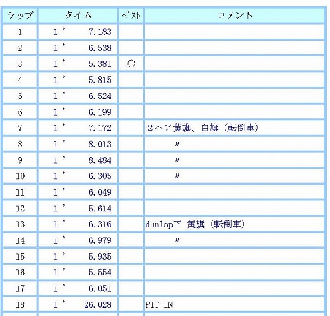 9:15〜9:35 B2クラス 9時15分になり、2本目の走行が始まりました。 1本目の走行で自分くらいのレベルであれば、ブリヂストンのR11でもPIRELLI のDIABLO SUPERCORSAと同じくらいのペースではしれそうなので、2本目は最初から飛ばしていきます。 ペースを上げていくと、4速で立ち上がる最終コーナでリヤタイヤが跳ねる感じ。 滑る感じじゃなくて、タイヤにバイブレーションが起きている様な感覚です。 ちょっと固すぎる(エアー圧が高すぎるかな) 3周目に早い段階で、5秒台に。 結果として、3周目の5秒3が今日のベストになりましたね。 5秒3が出るようなら、自分的にはPIRELLIのDIABLO SUPERCORSAと遜色はありません。 その後も5秒台〜6秒台で周回。 ブリヂストンのタイヤはコーナー進入時、フロントタイヤにプレッシャーをかけて潰すと旋回性が上がると言われています。 コーナーの進入時、ブレーキングでタイヤを潰せるようやってみましたが、前回まで履いていたPirelliの方が潰れている感覚がありました。 そして、旋回中フロントに体重を載せるようにすると、旋回性が上がってクルっと向きを変える感覚がありました。 なので、乗り方を今風のハンドルに覆い被さる様に乗ったほうが良さそうです。 乗り方を変えた方が良さそうですね。 あと、最終コーナーの入口、ブレーキングをしながらバンキングしていくところで、フロントに弱いチャタリングがありました。 以前も発生して、去年の8月にステアリングステムのベアリングを交換して、チャタは解消したと思っていたんですけどね? 7周目に2ヘアピンで転倒車があって黄旗が提示。 救急車がコース位入ったので、ペースを落とします。 4周ほどで、コースがクリアになったので、ペースを上げますが、13周目のDunlopブリッジ下でふたたび転倒車があって、黄旗提示でペースを落とします。 Dunlop下での黄旗が2周ほど提示されて、その後コースクリアー。 15周目、16周目に5秒台には入りましたが、すでに疲れが出て3周目のベストを更新できず。 17周目にチェッカーが振られて18周目にピットインします。 |