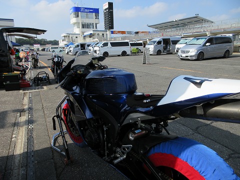 9:54 2本目の走行に向けて パドックをウロウロして、走行10分前になったので、CBRのところに戻ってきました。 エンジンをかけて、水温を上げておきます。 |